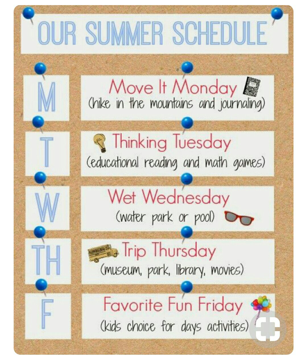 This was a great example of a summer schedule that was found on Pinterest. It is simple and fun. You can always change it to make it work for your family. Your kiddos won’t be bored if they know what is going on daily.